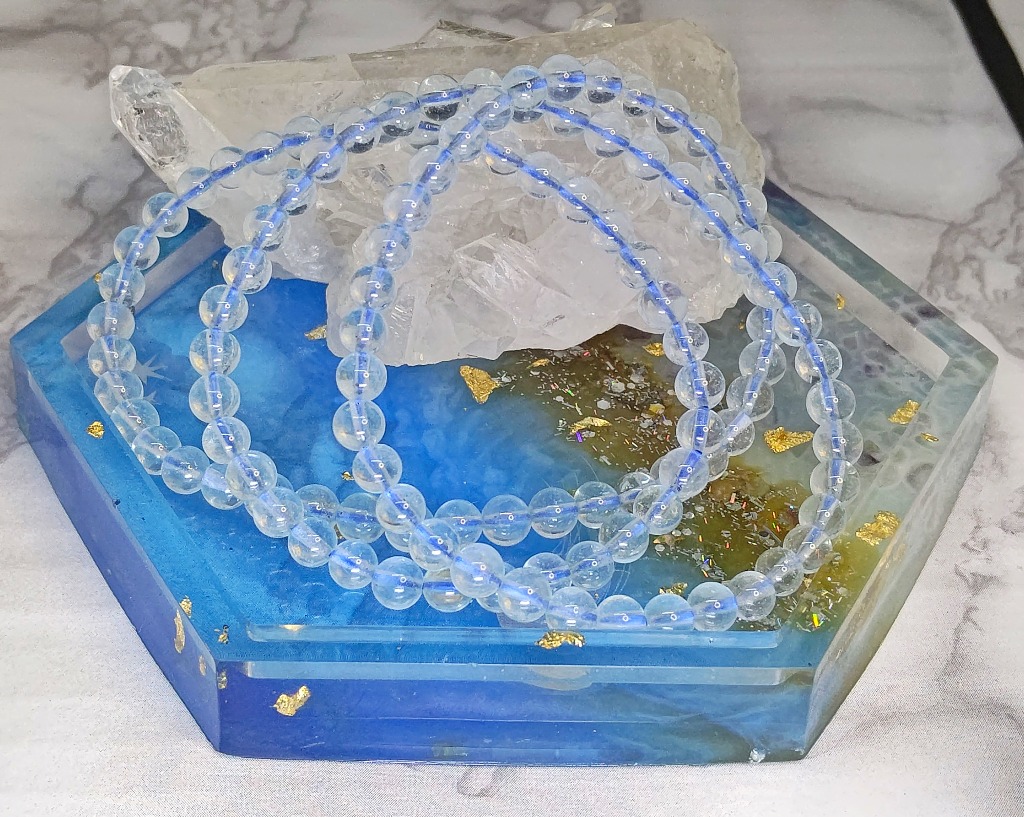ムーンストーンの代名詞といっても過言ではない【シラー】は、カリウムを多く含む正長石(オーソクレース )と曹長石( アルバイト )の2つが交互に重なり合うことで生まれ、曹長石の層の厚みによって光の色が変化し、厚いと白いシラー、薄いと青いシラーになります。 青いシラーを放つ石はブルームーンストーン と呼ばれ、稀少価値の高いものとして人気があります。